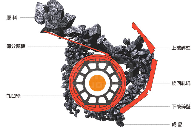 粗碎旋回破碎機主要由進料斗總成、上破碎壁、下破碎壁、傳動總成、旋回軋輥、篩分篦板、防護罩、機架、液壓調整及過載保護裝置組成。