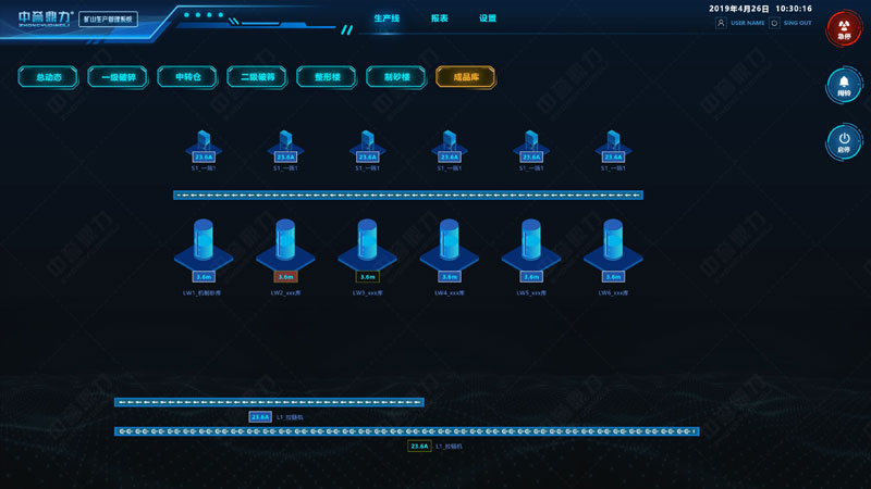 DCS系統可可設置半成品料庫、中碎篩分料倉、成品料庫料位高度上上限、上限和下限值,并有停機及報警提醒。