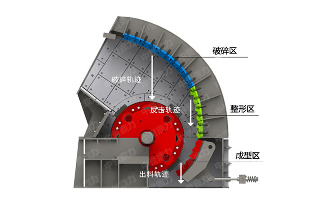 通過電動機帶動轉子的高速旋轉,由于轉子的高速旋轉,當物料進入板錘作業區時,受到錘頭的沖擊、碰撞、剪切等作用而破碎,已破碎的石料被拋到反擊裝置上得到再次破碎,之后被彈回板錘作用區重新破碎,石料經過多次反復破碎直至合格被排出。