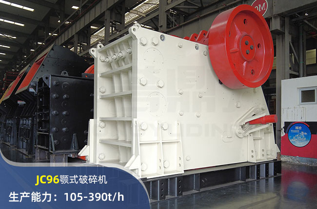 JC96顎式破碎機進料口尺寸930×580mm,進料粒度≤480mm,出料大小≤60mm,電機功率90kw,時產在390噸左右。