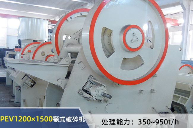 PEV1200×1500顎式破碎機進料粒度要求<1020mm,排料調整范圍180-340mm,時產能350-950噸之間,配備電機功率為160-200千瓦,重量為83噸。