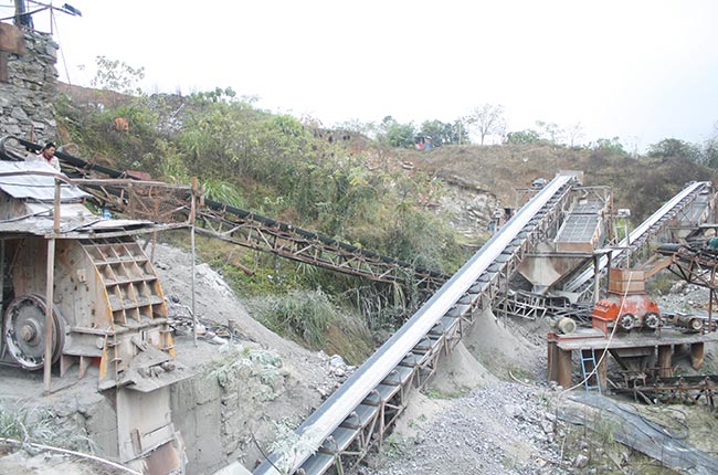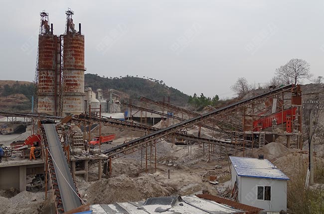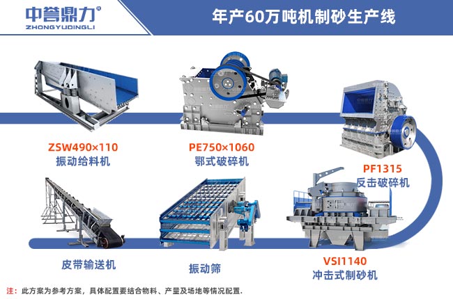 設備配置:ZSW490×110振動給料機、PE750×1060顎式破碎機,PF1315反擊式破碎機,VSI1140制砂機,振動篩,輸送機若干。