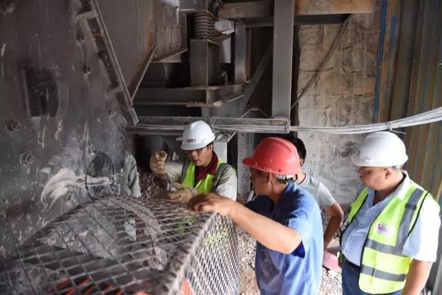 現場,鼎力安裝工程師、銷售經理、售后服務經理了解到該生產線的產量沒有達到設備時產量時,立即開始檢測設備、查找原因。經過查看用戶的破碎原材料,發現原材料里含有硅巖,加劇了破碎機錘頭磨損程度,進而影響產量。建議在破碎前將硅巖層剝離掉,避免錘頭磨損嚴重的情況再次出現。