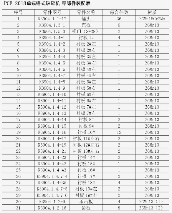 2018單段錘式破碎機多少個錘頭? 匿名用戶提問于:2022-08-09 14:14:09 2018單段錘式破碎機有36個錘頭,采用ZGMn18Cr2Mo材質,即高錳鋼錘頭。 該回答是否解決您的問題是否 溫馨提示:如果上述問題和您的問題不同,可在線咨詢技術人員咨詢技術 工程師回答 2018單段錘式破碎機有36個錘頭,錘頭材質為ZGMn18Cr2Mo,即高錳鋼錘頭。在實際使用中錘頭磨損到原來重量的60%時,應及時更錘頭,避免對產量造成影響。PCF-2018單端錘式破碎機技術參數進料口尺寸2828×2480mm進料粒度<1000mm轉子回轉速度300r/min出料粒度≤25mm生產能力350-500t/h電機功率630-710kw 中譽鼎力張工擅長 選型 工藝配置穩妥回答 還沒有符合您的答案?快速電話咨詢 咨詢電話:400-700-2111 提交問題,3分鐘快速解答 咨詢設備: 請選擇您想咨詢的設備 錘式破碎機 鄂式破碎機 反擊式破碎機 旋回破碎機 振動篩 給料機 其它礦山設備 怎么稱呼: 聯系電話: 快速解答12761條問題已在線解答我要提問3-15分鐘獲得快速解答