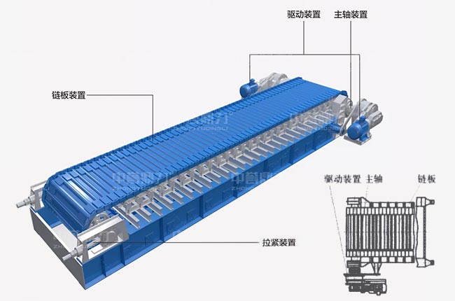 板式給料機的組成部分包括機架、主軸裝置、驅動裝置(電動機、聯軸器、減速器)、鏈板裝置、拉緊裝置、支重輪、托鏈輪等。