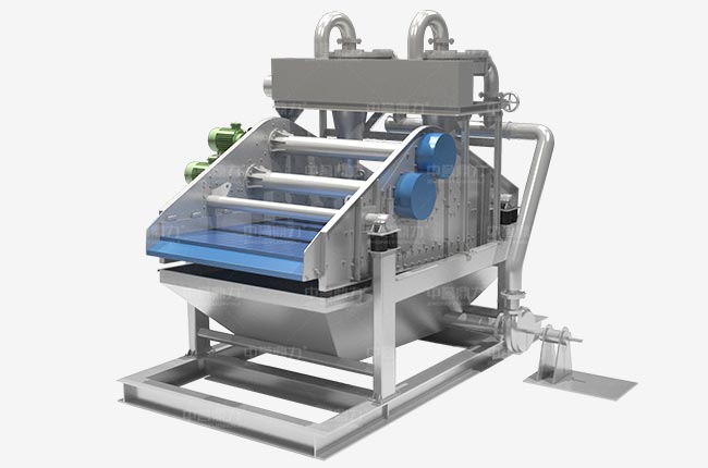 細沙回收脫水一體機工作時渣漿泵將篩水混合物輸送至旋流器,離心分級濃縮的細沙經沉沙嘴提供給脫水篩,脫水篩負責清洗、分級、脫水后,細沙、泥等經溢流水箱流入污水處理系統。