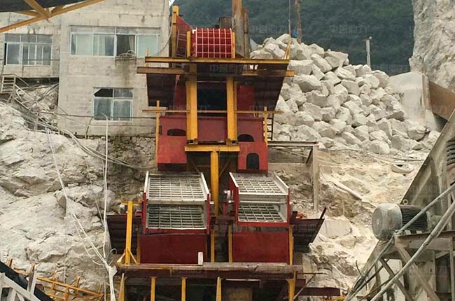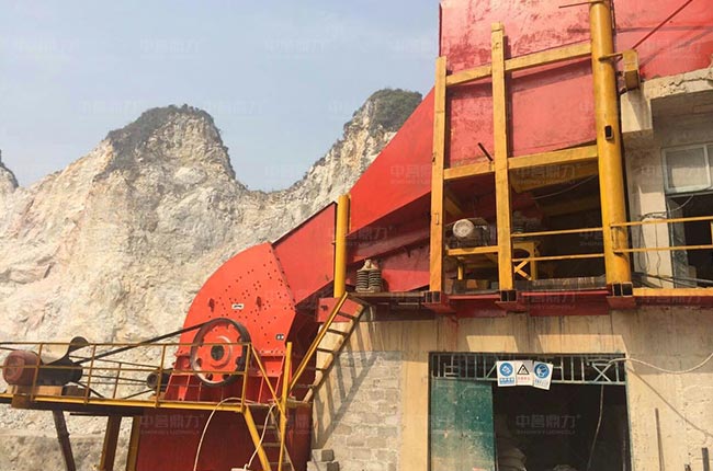 原石料通過卸料倉,由棒條式給料機對原料進行預處理,篩下的石料通過振動篩篩選,反擊破細碎,再次篩分,其余大規格的骨料通過給料機均勻連續送進1615重錘破破碎,直接通過振動篩篩分,部分大規格石料會經過反擊破二次加工,其余混合料通過振動篩篩分不同規格的石料。