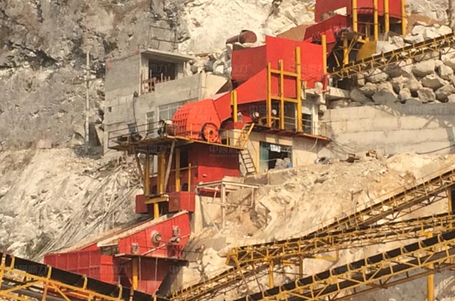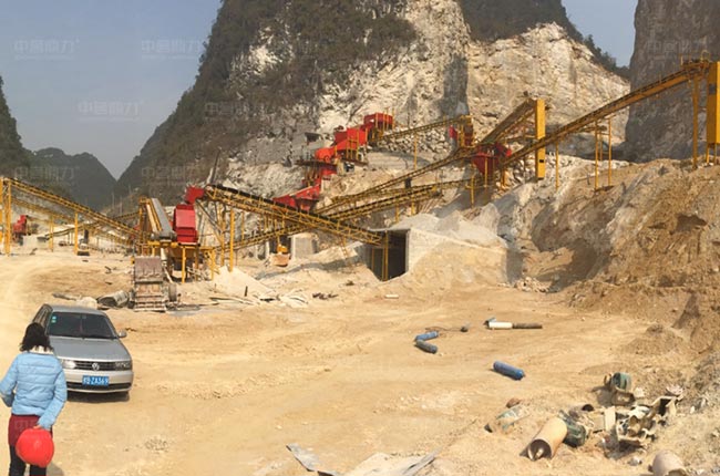 廣西河池這條時產800-1000噸建筑骨料生產線屬于階梯式設計方案,原料由棒條給料機預先篩分,其余原料通過PCZ1615錘式破碎機破碎,還有反擊破設備對不符合要求的石料進行細碎加工,生產的骨料規格多,粒型好。