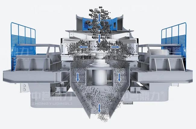 中譽鼎力VSI沖擊式制砂機是利用高速運動的物料相互碰撞、摩擦自行破碎,在破碎的同時進行了石料的整形處理
