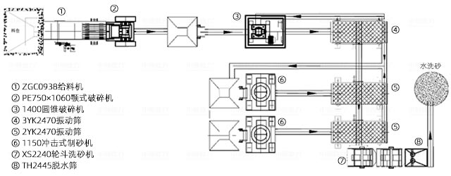 | 方案二 | GYS400圓錐破碎機+VSI1140制砂機+3YK2460振動篩+XS3500洗砂機及配套設備 | 圓錐破破碎后由制砂機進一步加工,經篩分和清洗后,成品砂的質量和級配更優,能地滿足建筑用砂要求 |